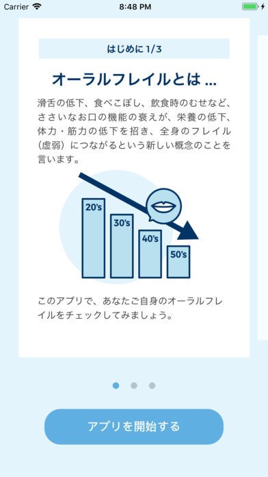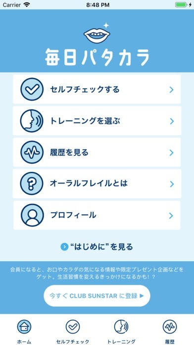 口まわりの機能が年齢と共に弱っていくことを「オーラルフレイル」と言います。このアプリではオーラルフレイルを和らげることができる「パタカラ体操」を用いて、誰でも簡単にお口の健康を取り戻すことができます。