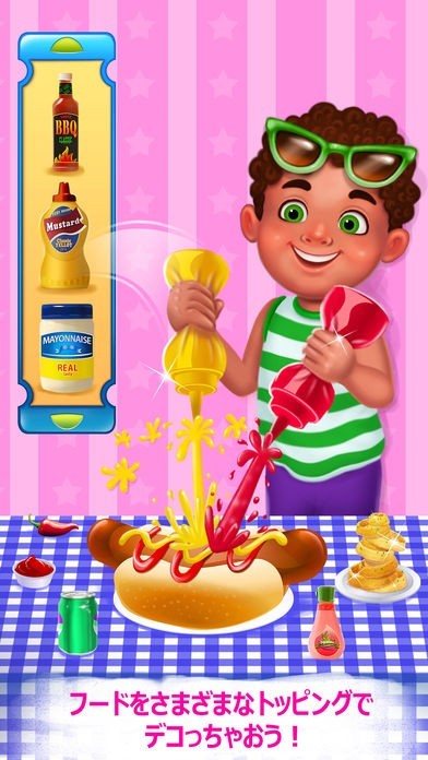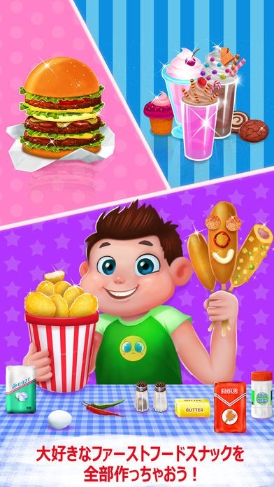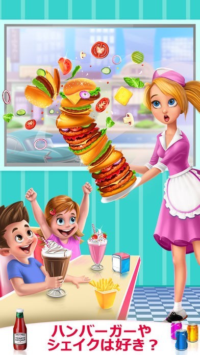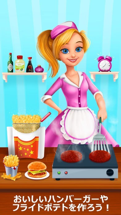 App Storeより引用~~> ハンバーガータイム!ハンバーガーやシェイク、フライドポテト、ホットドッグなど、さまざまなファーストフードを作ろう!