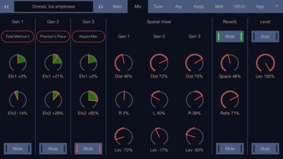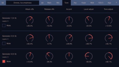 App Storeより引用With the special lightweight version of SynthScaper LE you can easily create and modify your own multi-timbral pads and atmospheric soundscapes. Three separate sound generators in this application give you possibility to create complex sound scenes by mixing and moving them in a common sound space using a spatial mixer. No need to construct a new sound from the beginning. Just use the built-in library of unique and high-quality presets for sound generators.