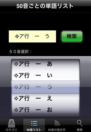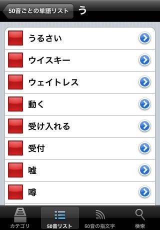 状況や場面にあわせた単語をカテゴリー別で簡単に検索。また、50音別で検索が可能です。
