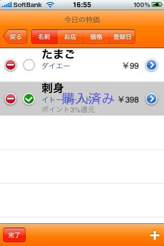 購入した商品は「購入済み」へと変更できるようになっています。1タップで変更が完了するのも便利なポイント。購入後はすぐに「購入済み」へと変更しておけば、混乱せずにリストを管理することができます。