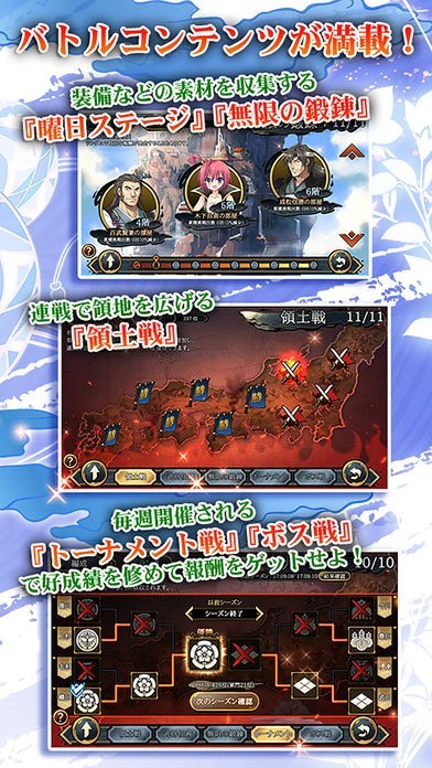 『覇道モード』ではプレイヤー同士が覇を競「領土戦」や強い武将に挑戦する「無限の寺院」など様々なコンテンツが用意されています。