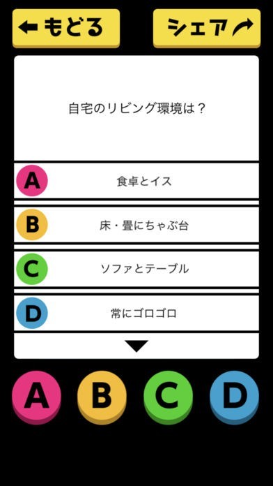 表示される質問に対応するボタンをタップし、答えてください。。ボタンは色分けされ、アルファベット順に並んでいます。選択肢は基本的に4択です。該当するものがなくても1つ選んでください。