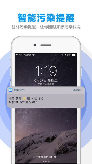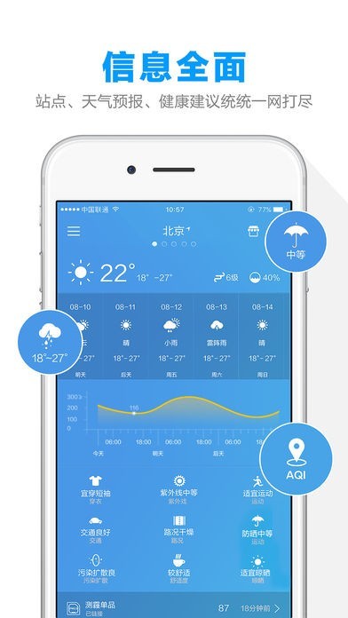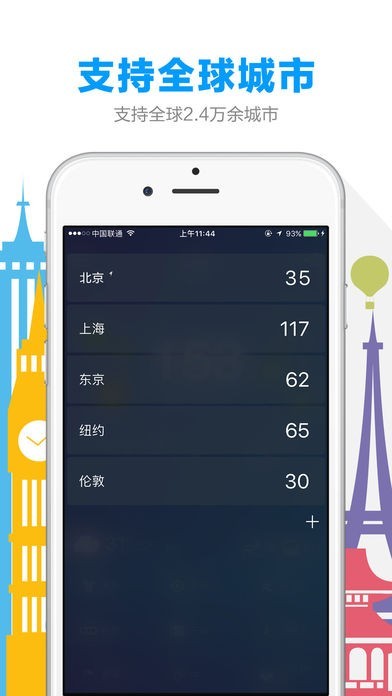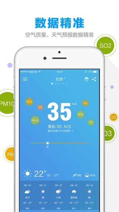 - 支持全球城市空气质量和天气查询、上万 个监测站点的空气质量信息。
