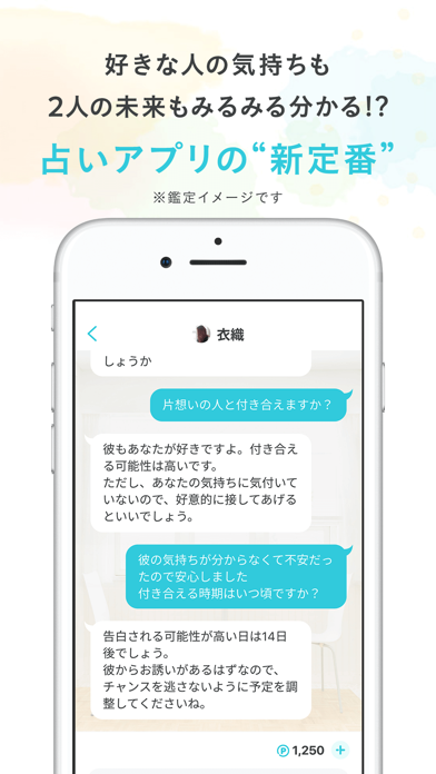 初回ダウンロード時におためし1,000ポイントプレゼント。また、占いでの個人情報相談内容は確実に保護してくれるので安心です。制度の高い鑑定を24時間いつでもしてくれる嬉しいアプリです。