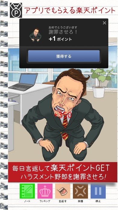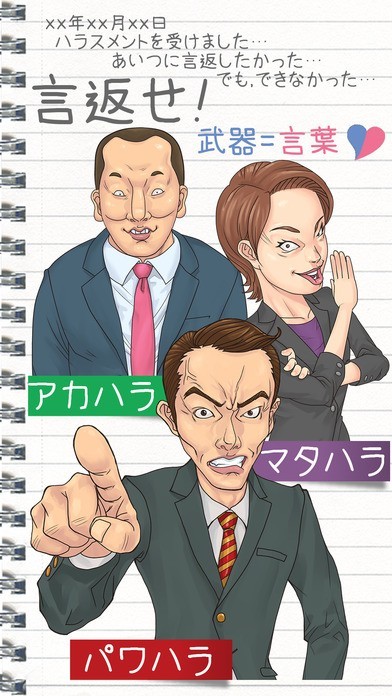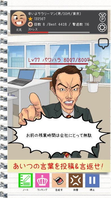 上司の言葉に言い返せなくてションボリ、そんな経験をしたことはありませんか? 「バカ野郎!」は、言葉を武器にして相手にぶつけるカジュアルゲームです。 画面に現れる上司に対して、言い返すボタンをタップ。言ってやりたい文章を入力しましょう。 入力した文章によって上司にダメージを与えられる他、言い返しを続けることで土下座させることができます。 出現する上司を変えたい時には我慢ボタンをタップし、ストレスを溜めることで新たな上司が敵として出現します。 ノート機能も搭載。これまでのハラスメントに対する言い返し一覧などを確認し、ストレス解消に役立ててみればいかがでしょうか。