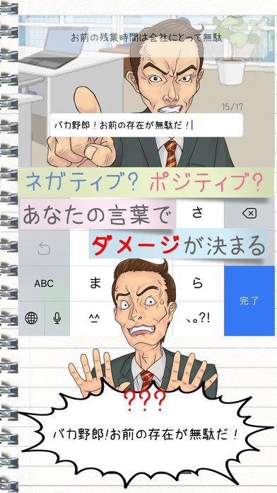 言ってやりたいセリフを入力し、画面に出現する上司にぶつけよう。文章によってダメージが変化!