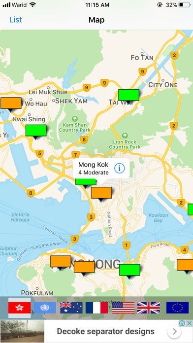 Users can view the pollution levels quickly on a map or in a table view, and drill down into more specific information about how certain countries would regard the current air quality in Hong Kong. Several nations provide specific warnings to their citizens in the event the air quality reaches a certain warning level. Information is update hourly so people can plan their outdoor activities at times when pollution levels are minimized.