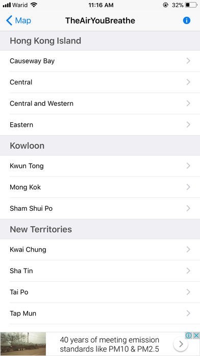The AirYouBreathe displays the current air quality in Hong Kong using a variety of different air pollution indexes from around the world. The pollutant information from multiple reporting stations around Hong Kong is run through the air pollution indexes of other countries to produce a more accurate picture of the current air quality.