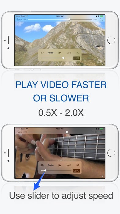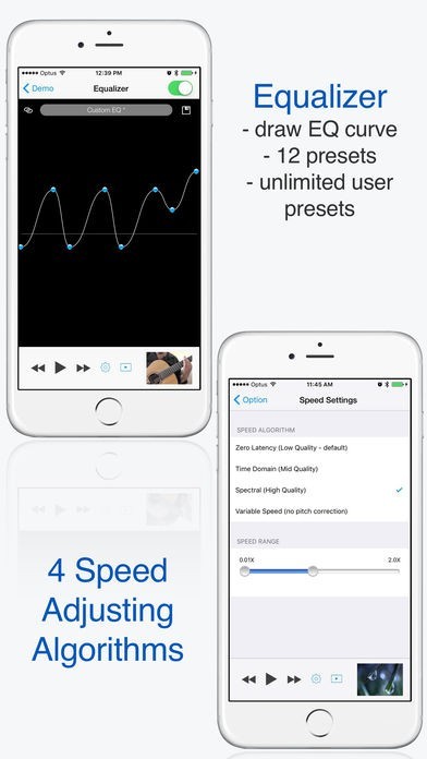 特に再生速度の変更に強いのがこのアプリの特徴です。再生速度は0.5倍のスロー再生から2.0倍の倍速再生に対応しており、再生速度を変更しつつオーディオピッチを変更・保存することができます。