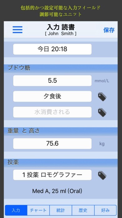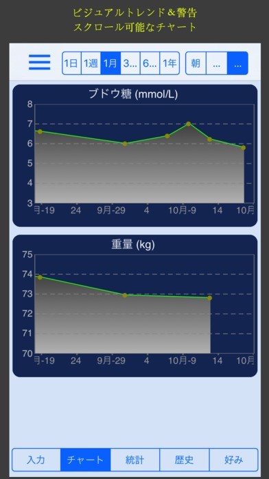 毎日の血糖値を手軽に入力!チャート機能で数値の変化を視覚的に確認!