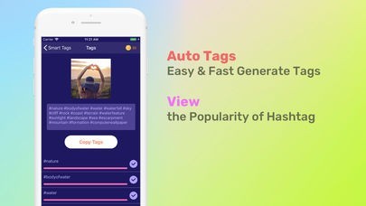 Search popular tags and view the popularity of them, instantly copy them to social media. For the smart tags are just pick up a photo from your gallery or take a picture with your camera and then the app will do its magic. The app will return some hashtags related to the picture automatically. You can then share those hashtags with Instagram, Facebook, Twitter or any other social media.