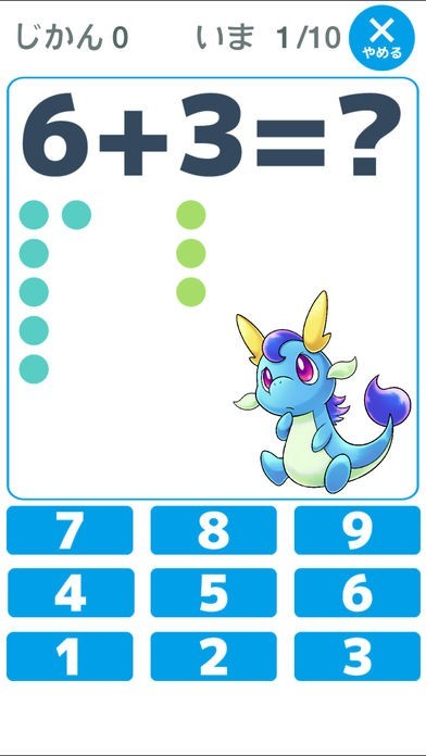 このアプリではドラゴンのかわいらしいキャラクターがガイドとして一緒に遊びながら学んでくれるので、お子さんでも苦痛を感じること無く使用してくれるはずです。 数を数えることから学習できますが、車などの絵が書いてあるので、最初は指を折りながらしっかりと数えていくことが出来ますので、苦手意識を覚えずにすみます。 また足し算から引き算までも学習できますが、数字の下に丸が数の分だけ表示されるので、最初は数を数える延長として問題を解くことが出来るような工夫がされているので、徐々に難易度を上げていきながら学習出来る工夫がされています。 よって算数が嫌いになってしまうのを防ぐことが出来ますし、慣れてきたら時間を意識させて、はやく答える練習も可能です。 操作は下に表示されている数字のボタンをタップするだけです。