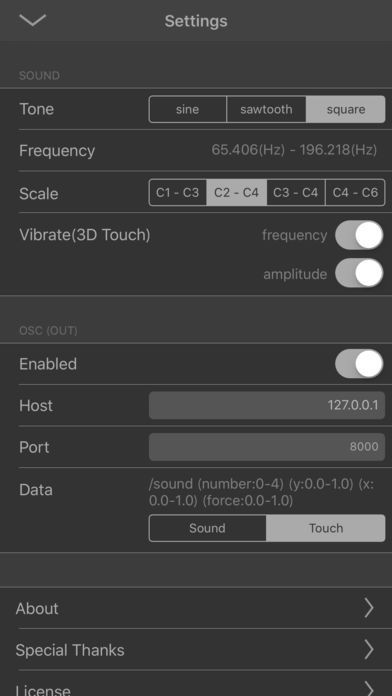 - 『音の周波数 / 音の振幅 / 3D Touchの強さ』をOSC(Open Sound Control)を使ってネット送信