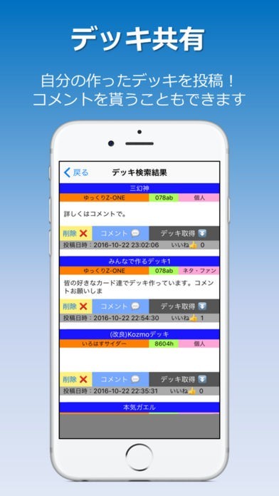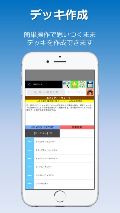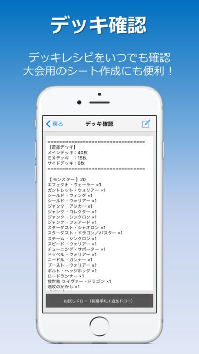 本アプリケーションにはアップデートにより最大20組までのデッキレシピを登録することができるので、いつでも簡単にデッキを交換して、友達とデュエルを楽しめるようになっています。