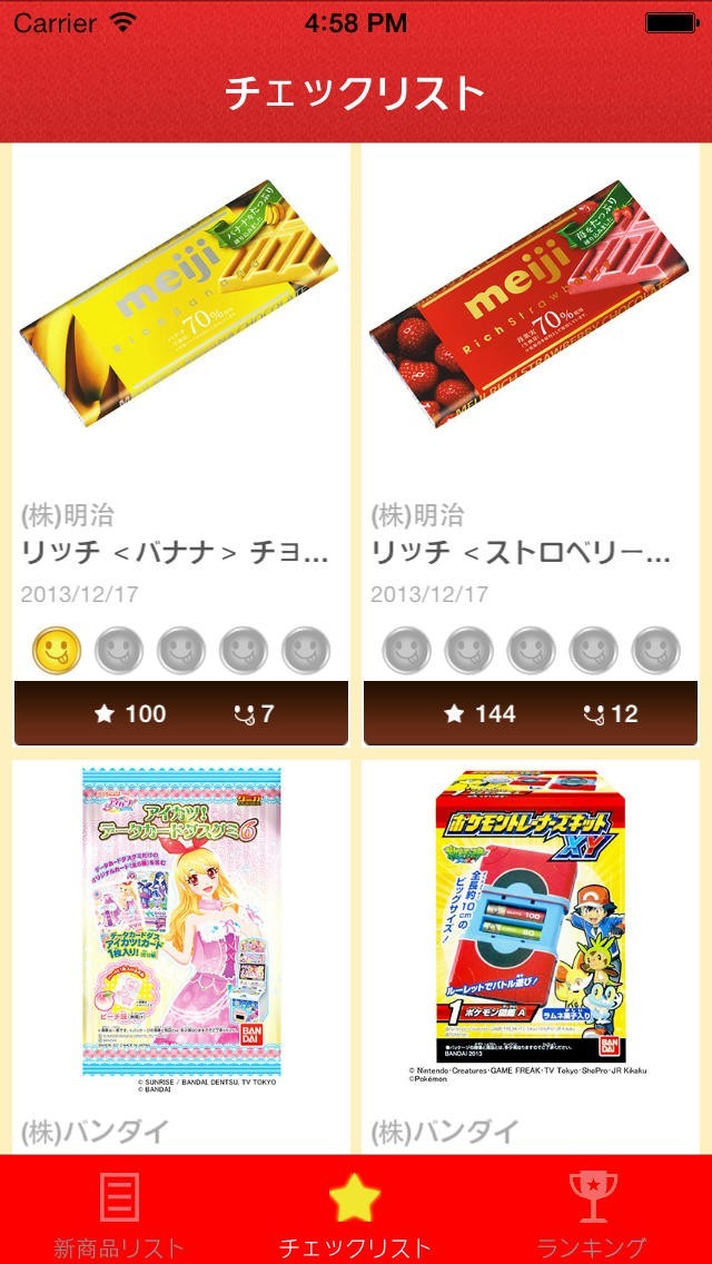 どのぐらいの数のユーザーが実際にお菓子を食べ、チェックリストに保存しているのかが商品ごとに表示されます。これにより、各商品に対するユーザーからの注目度が分かるため、お菓子選びの判断材料として使うと便利です。
