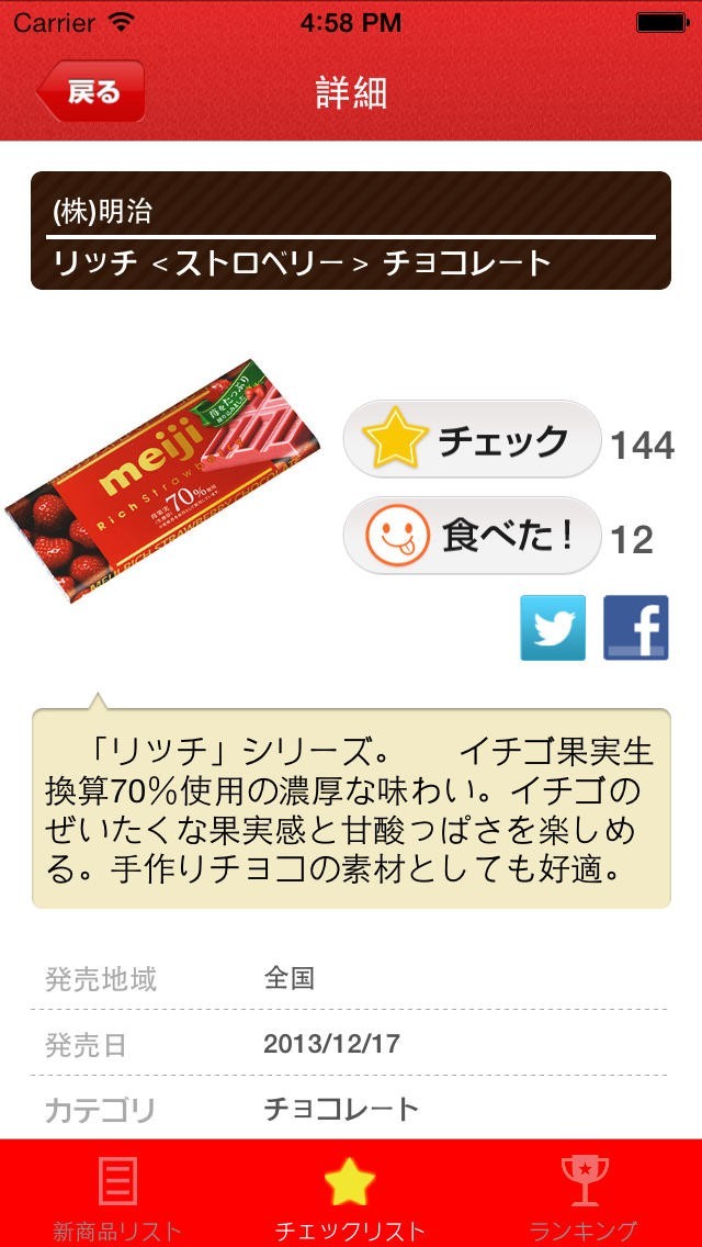 アプリに掲載されているお菓子の情報は、FacebookやTwitterで共有することができます。SNSに共有することで、気になる商品や美味しかった商品を忘れないよう記録することもできますし、友達や家族に知らせることもできます。