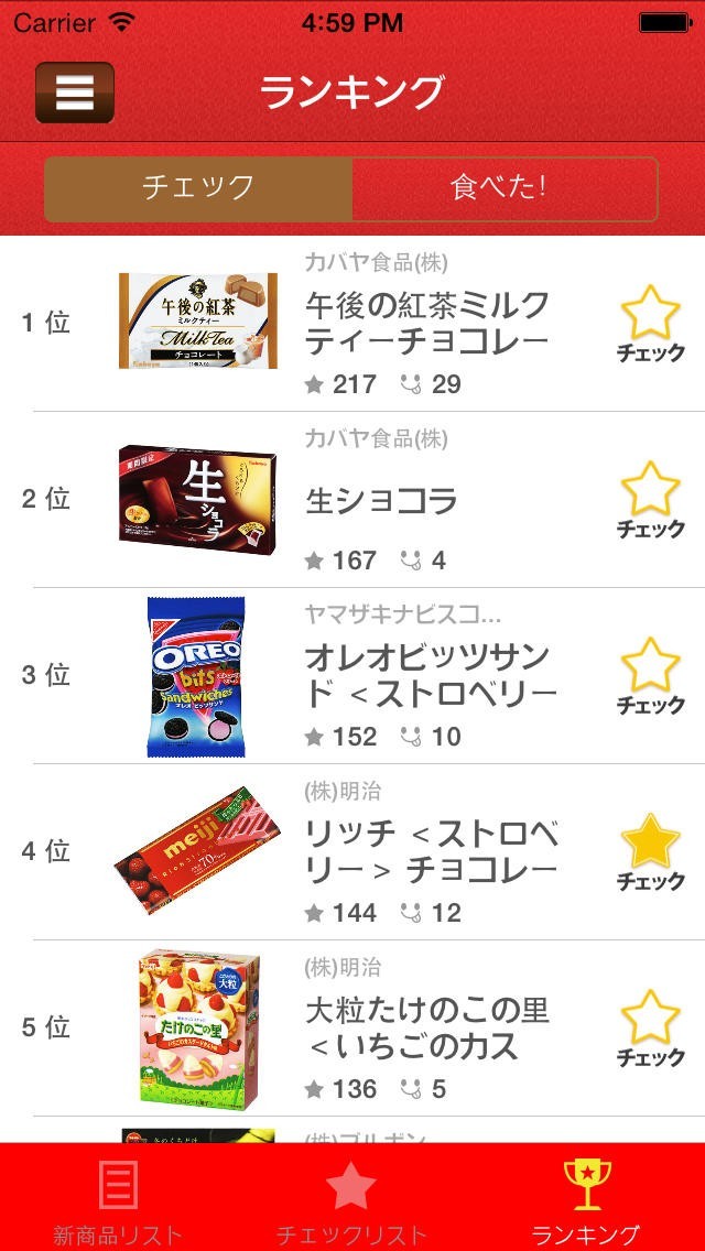 気になるお菓子だけを一覧表示できるチェックリスト機能が便利!