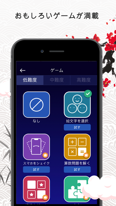 記憶ゲーム、パズルゲーム、スマホをシェイク、計算、ブリックブレーカーゲーム、絵文字ゲームなど、様々な機能を搭載