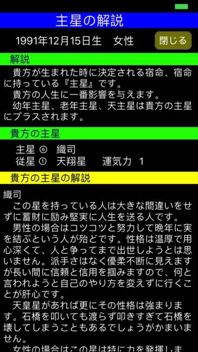 生年月日から分かる自分の「星」をもとにして判明する、運勢の浮き沈みや宿命についての「バイオリズム」を用いて、今日の運勢や長期にわたる人生の変動予想について占うことが出来ます。