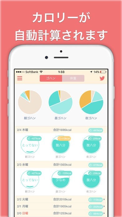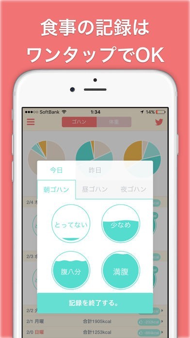 このアプリはとにかく記録を簡単に行えることから、続けることが苦にならないという点が魅力的です。よって、面倒くさがり屋でなかなか記録などを続けることができないというような方に向いています。 実際に3万ダウンロードを達成しており、多くの方に愛されるようになっており機能も洗練しています。 細かく記録するというよりも「とってない」、「少なめ」、「腹八分」、「満腹」の中から選ぶという機能によってデータを残しておくことが出来るので、いちいち食材や、料理などを探し出して、どれくらいのカロリーなのかを調べるというような手間がかかりません。 そのようにしてとったデータはグラフによって表示されますし、使っていくうちに体重の変化から摂取カロリーを計算していくことで自分の感覚とアプリのデータの精度が上がってより正確な情報を残しておくことが出来るようになるので、長期間使うことでより正確なデータを得ることが出来ます。 他にも太りたい方にも対応できるので、ダイエット目的以外で使っても同じ効果を期待できます。