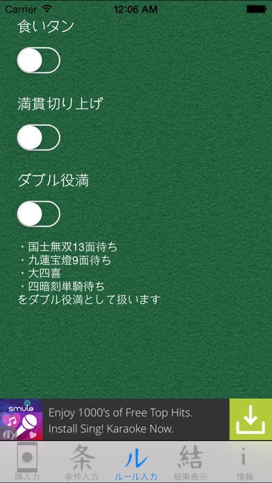リーチをしているか、自風は今どこにあるかなど、アガったあとの様々なシーンに対応出来る条件変更機能も搭載されています。また、食いタンの有無などの細かいルールにも対応しているため、上級者も満足出来るものになっています。