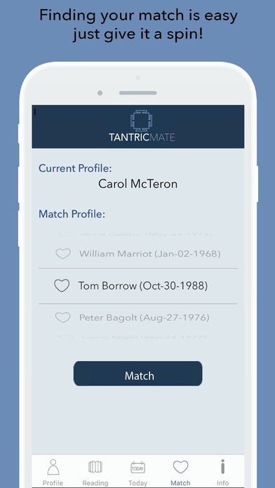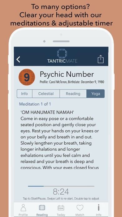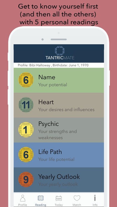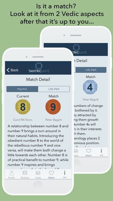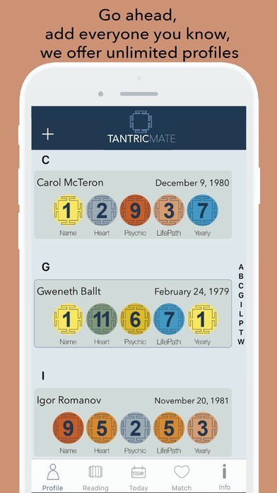 TantricMate は、プロファイルごとに 5 つのヴェーダ数字の読みを計算します。名前と生年月日に基づき、プロファイル リストの全員と 2 の numerological 一致朗読を提供しています。 それの上に TantricMate が毎日頭スタートの毎日の数を計算します。