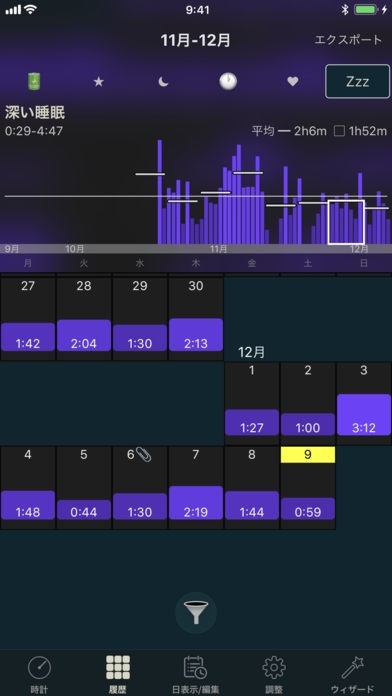 毎日どれくらい眠れているか記録され、睡眠状況を客観的に見直すのに役立ちます。
