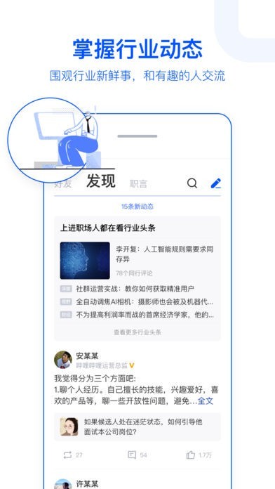 App Storeより引用脉脉,职场人追捧的商务社交神器!相比于线下耗时耗力的商务社交,脉脉借助独有的“职业认证+实名社交”,帮助职场人更方便高效地在线上拓展人脉、交流合作、求职招聘,能极大地提升工作效率和增加职业机遇。职场人都在用脉脉,你还不来?