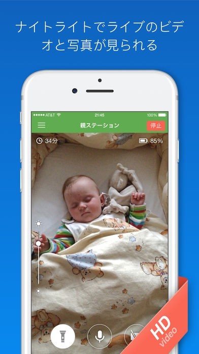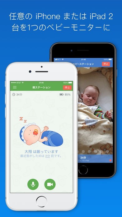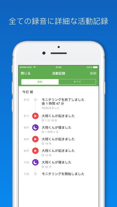 眠っている赤ちゃんの様子をiPhoneから確認できます。また、アプリは赤ちゃんの目覚める頻度えよなどを関知して自動的に活動記録をつけてくれるので眠りのリズムがつかめます。