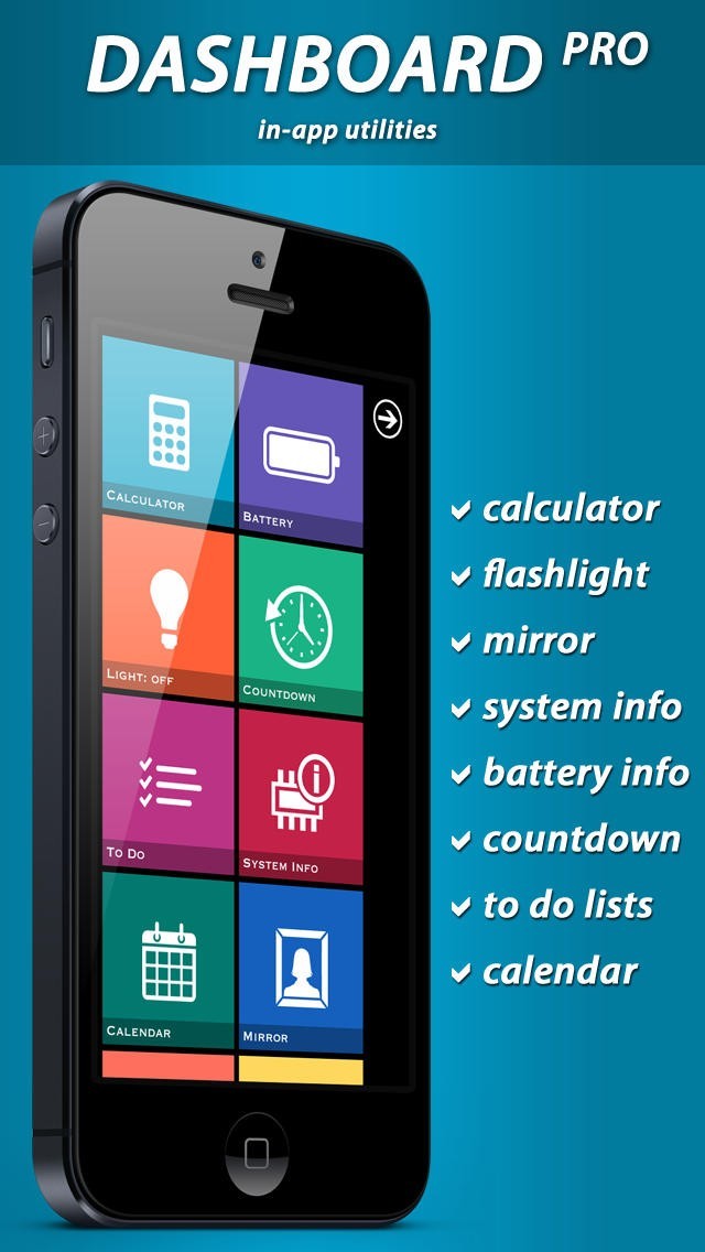 calendar, calculator, mirror, flashlight, to do lists, system info, battery monitor, countdown timer