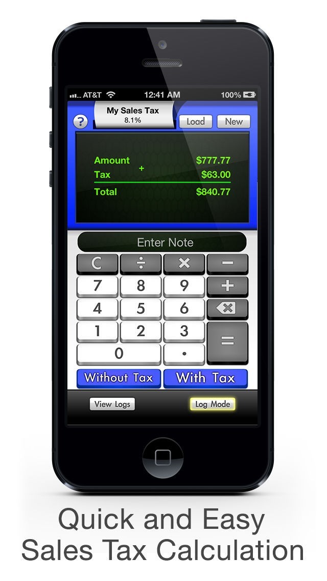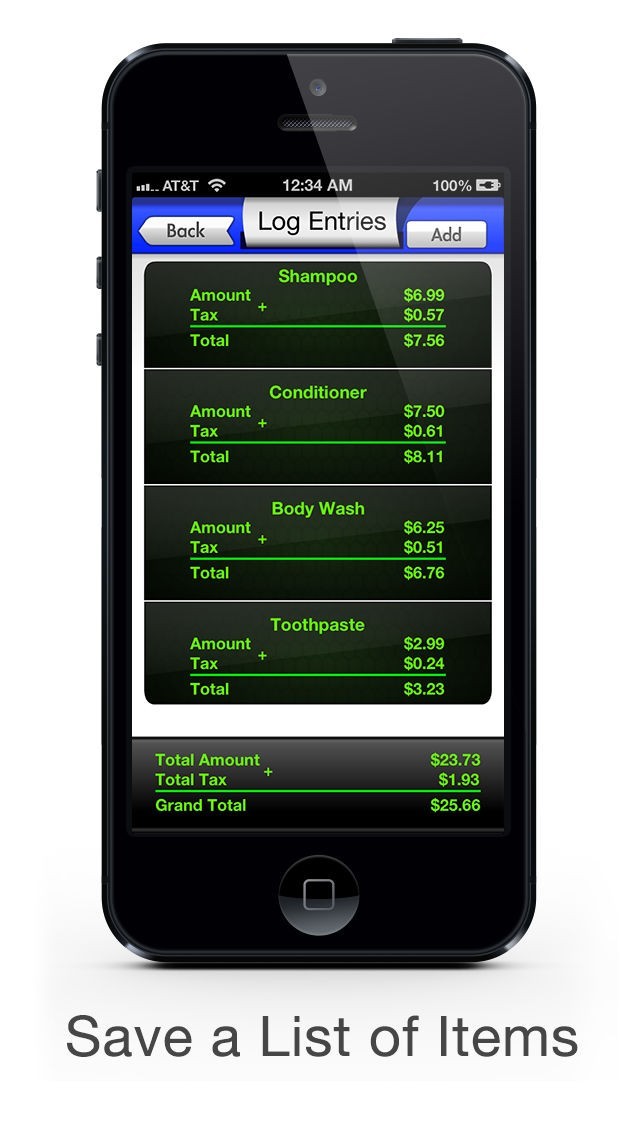 The exciting Log Mode feature gives you a quick and easy way to save lists of items. Once items are added to a list you can see the amounts, taxes and totals for all items in the list. Items can be added to the lists, deleted and even modified. You can easily switch between the basic sales tax calculator and Log Mode, so if all you need is a simple and easy to use sales tax calculator, Log Mode will not get in the way.