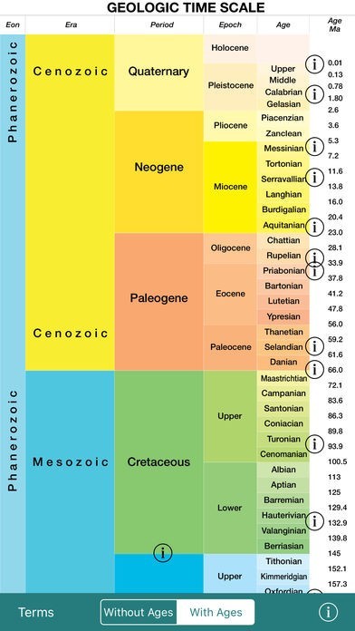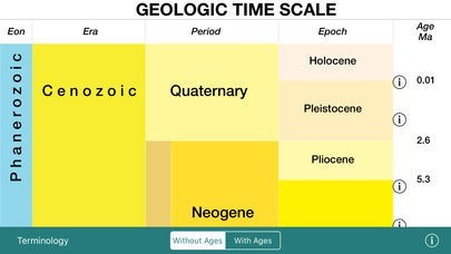 App Storeより引用The Geologic Time Scale shows the names of the eons, eras, periods, epochs, and ages along with their corresponding dates.