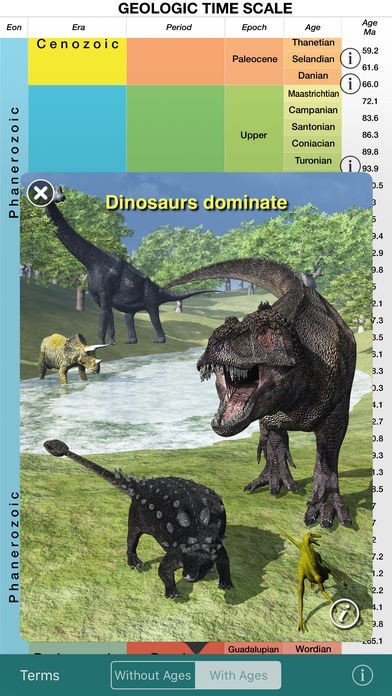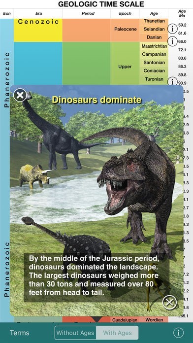 EASY TO USE: No internet connection required after download. Ideal for field use. Just touch the button in the toolbar to display the names and dates of the ages. Touch the info icons to see the illustrations. For each illustration, touch the "more info" button to read about life on Earth at that time.