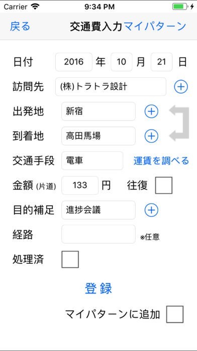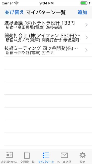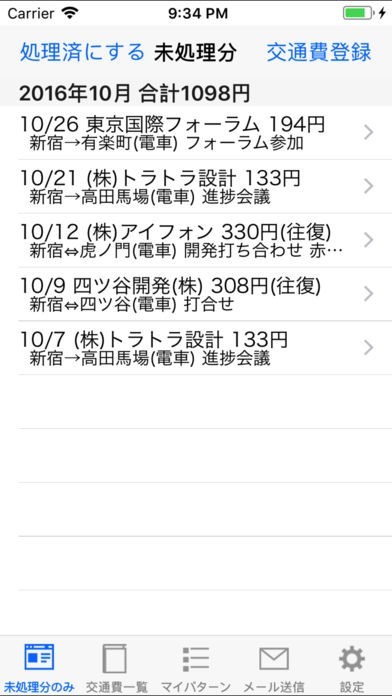 入力した交通費が既に精算済みか未処理分か分かるように管理されています。シンプルで分かりやすい画面、内容を確認したい時は画面をタップするだけです。よく利用するルートはマイパターンに登録しましょう。