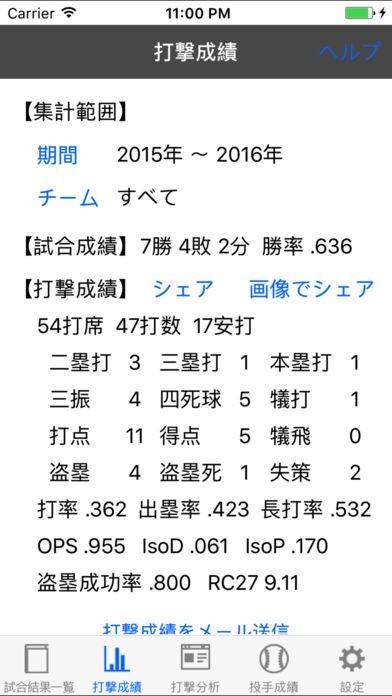 シェア機能を搭載しています。試合結果や成績はTwitterやInstagramに投稿可能。家族に試合結果を伝えたり、同じ草野球を趣味とする仲間と一緒にワイワイ盛り上がることができます。