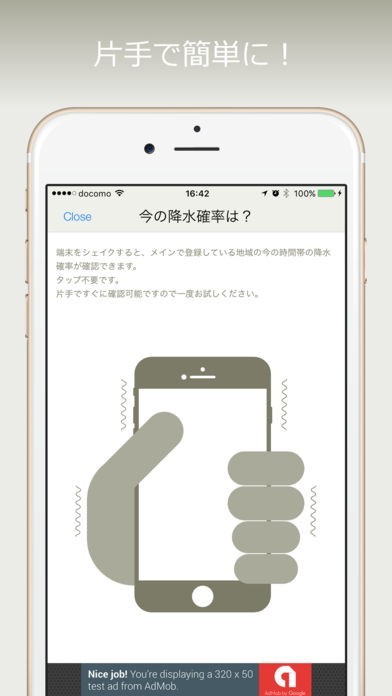 荷物などを抱えていて画面に触れない場合でも、気象予報を閲覧できます。端末を降ることでアプリの起動設定ができ、自動的に登録したエリア内の雨のリスクを数値によって表示できます。