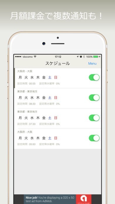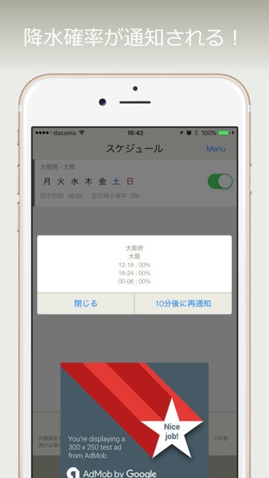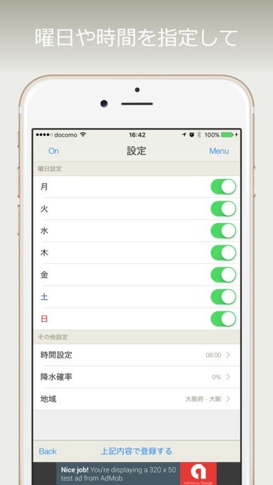 ユーザーの設定した間隔で配信される降雨データは、曜日単位でカスタマイズできます。そのため仕事の日以外はオフにしたりと、外出する日しない日を想定して調節できるので必要な日だけデータを受け取れます。