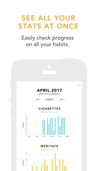 Each tracker is fully customizable. Set your tracker to reset every day, week, month, year or never. Use TALLY's charts, calendars, and notes to analyze activity and detect any progress or patterns. The main screen will display all of your trackers. You can use a filter to display your trackers in a way that makes sense to you. Want to share you activity? Tally can export your data, including timestamps, to a CSV file that you can share and open in any spreadsheet program.