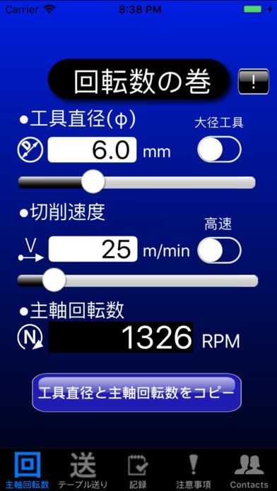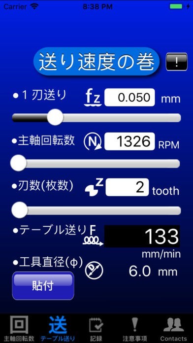 スライダーを搭載しており、どのような条件でもすぐに設定することができます。エンドミル、フェイスミルなどの工具を使用する際に重宝する数値計算アプリとなっています。
