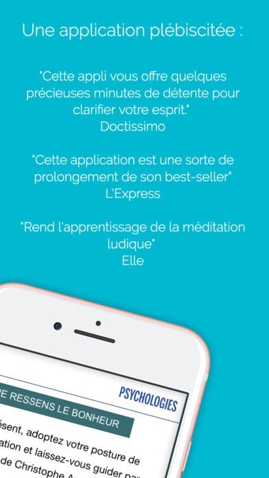 "L'app que je n'espérais pas trouver sur l'App store ! Christophe André est une référence dans la Méditation par la pleine conscience et l'App est bien conçue. J'aime l'idée de l'avoir toujours avec moi." - Assia DIB