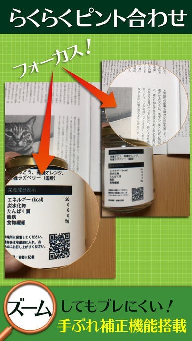 最近小さい字が読みにくい、そんな人に紹介したいのが「でか文字スコープ」です。拡大機能で文字を大きく表示してくれるので、新聞や本の字も快適に読めます。ライトの点灯もできるので、暗い場所で文字を読む時に便利です。オートフォーカス機能も搭載、多少スマホを動かしても、読みやすいように自動でピントを合わせてくれます。ピントが合わずに近づけたり、遠ざけたり、そんな作業も必要ありません。さらに、タッチで表示していた画像の一時停止機能も!拡大・縮小も自在なので、商品の細かい説明書きを読む時にも便利です。老眼に悩んでいるご老人にもってこいですし、ずっとスマホをかざす必要もなくなくなります。