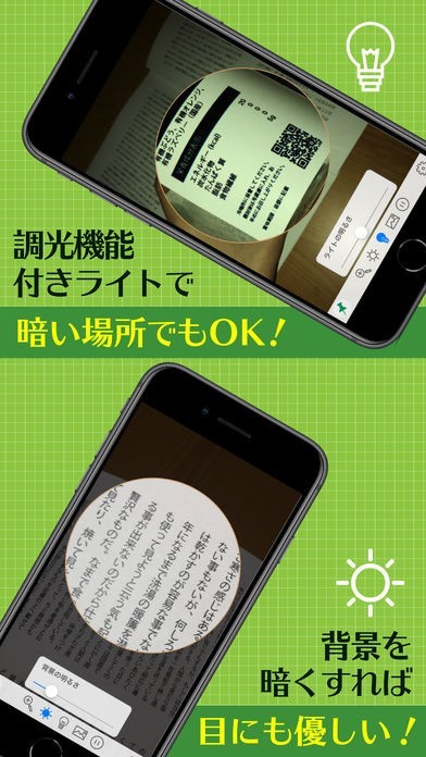 「でか文字スコープ(使いやすい拡大鏡)」はどうしても眼が悪くなったり、老眼になったりして文字が小さく見えてしまう人のためのスコープアプリです。読書などをするときに、或いは様々な説明書を読むときなどに重宝する機能があります。フラッシュ機能があり、カメラのフラッシュをアプリ側から点灯させるので暗いところでも簡単に利用することが可能です。拡大したところを停止させることができて、じっくりと読むこともできるようになっています。