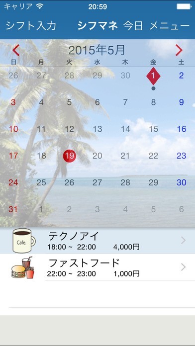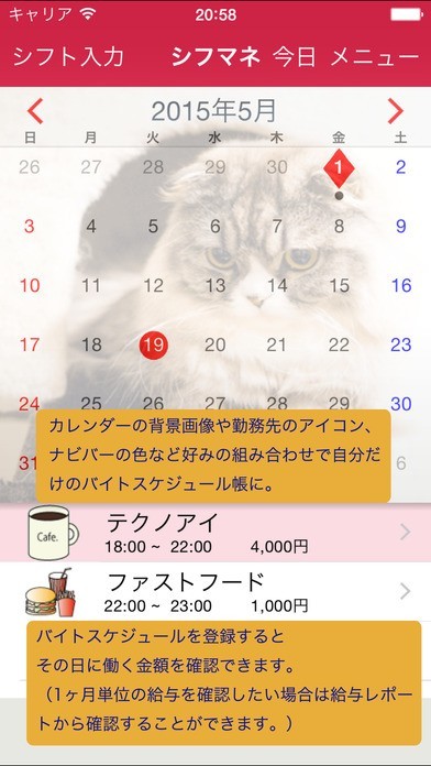 複数のアルバイト先で勤務しており、シフト管理が大変。「シフマネ」ではそんな方をサポートしてくれる機能を充実させています。シフト一括入力機能を搭載しており、面倒なシフトも楽に入力可能。勤務先をそれぞれ一括入力することで、混乱しがちなスケジュールも把握しやすくなるでしょう。給与表示機能では日給を1ヶ月単位で表示可能。勤務先でどれぐらい働いたか判りやすくなります。また、デザインカスタマイズ機能も用意。カレンダーの背景画像が手軽に変更できる他、勤務先ごとにアイコンカラーも変更できるなど、自分好みに細かくカスタマイズを行えるようになっています。