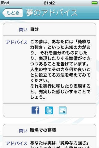 「DREAM-e」を使うことによって、夢を入力するだけではなく、AIの質問にこたえることでより具体的に夢について診断することができます。 よって、一般的な夢診断とは比較にならないほど専門的であり、役に立ちます。 結果はアドバイスとして表示してくれるので、それを参考にすることによって、人生の教訓にして、より良い毎日を過ごすことが可能です。 さいごにフェイスブックとツイッターへ共有できるので、同じ悩みを抱えている方がいたら解決のお手伝いをできるかもしれませんし、「アドバイスの記録」で情報を残しておくことも可能です。