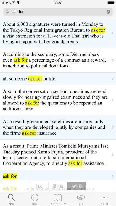 英単語、英熟語を入力して検索をかけると意味と用法が例文と一緒に一覧表示されます。ただ単に辞書で単語を調べるよりも効率よく覚えられると思います。