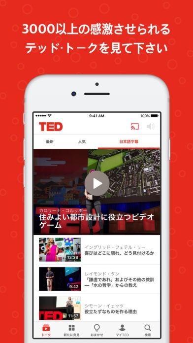 様々な著名人の講演映像を見ることができるアプリです。2000人以上の科学や心理学に関する講演が用意されています。字幕は100以上の言語に対応していて、日本語でも表示されます。講演内容で学べるだけでなく、字幕と合わせることで語学の勉強もできます。 ダウンロードしておけばオフラインでも見られるので場所を選ばずに利用できます。講演のテーマや時間を選ぶと、自動で条件に合ったプレイリストを作成してくれるので、時間に合わせて楽しめます。