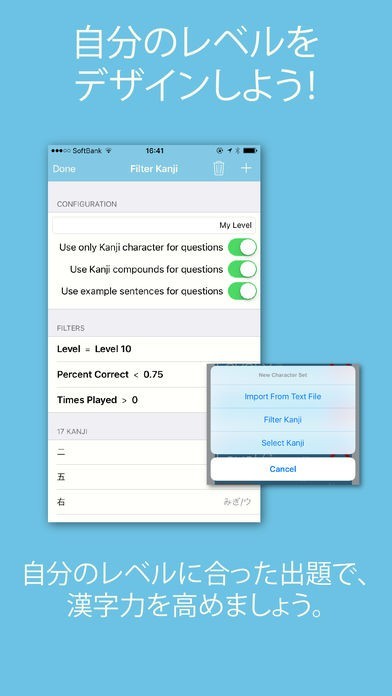 漢字検定のレベル分けに合わせた、漢字レベルが設定されています。