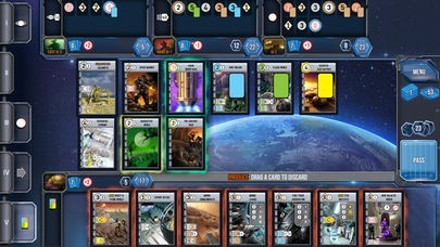 App Storeより引用Race for the Galaxy is a strategy boardgame where players advance their empire by playing cards to build technological developments or to settle planets. Its core mechanic is a phase choosing game. Players secretly and simultaneously determine which one of seven phases they will lock in, all reveal at once, then execute the phases in order. Will you build an engine to ramp up VP generation on cheapo production planets? Will you invest in exploration and settle rare and valuable VP rich planets? Or will you rush a military conquest to cut off your opponents before they have a chance to develop their strategy?