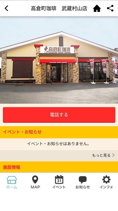 高倉町珈琲は、最新メニューの情報や月替わりの限定クーポンなどが届きます。 MAP機能があります。GPSを使って、現在地から近いお店を地図で店舗検索します。地図を見ながら移動できるので、迷わずお店まで行けます。店舗情報も見れます。 お気に入りに登録できます。よく利用するお店は、お気に入りとして登録可能です。イベントは店舗によって異なるので、登録しておくと確認しやすいです。 クーポンのアイコンをタップすると、限定のお得なクーポンをチェックできます。朝食から夕食まで利用できるお店でメニューの幅が広いので、お得に食事やスイーツを楽しめます。プッシュ通知で、お得な情報やキャンペーン情報は知らせてくれます。